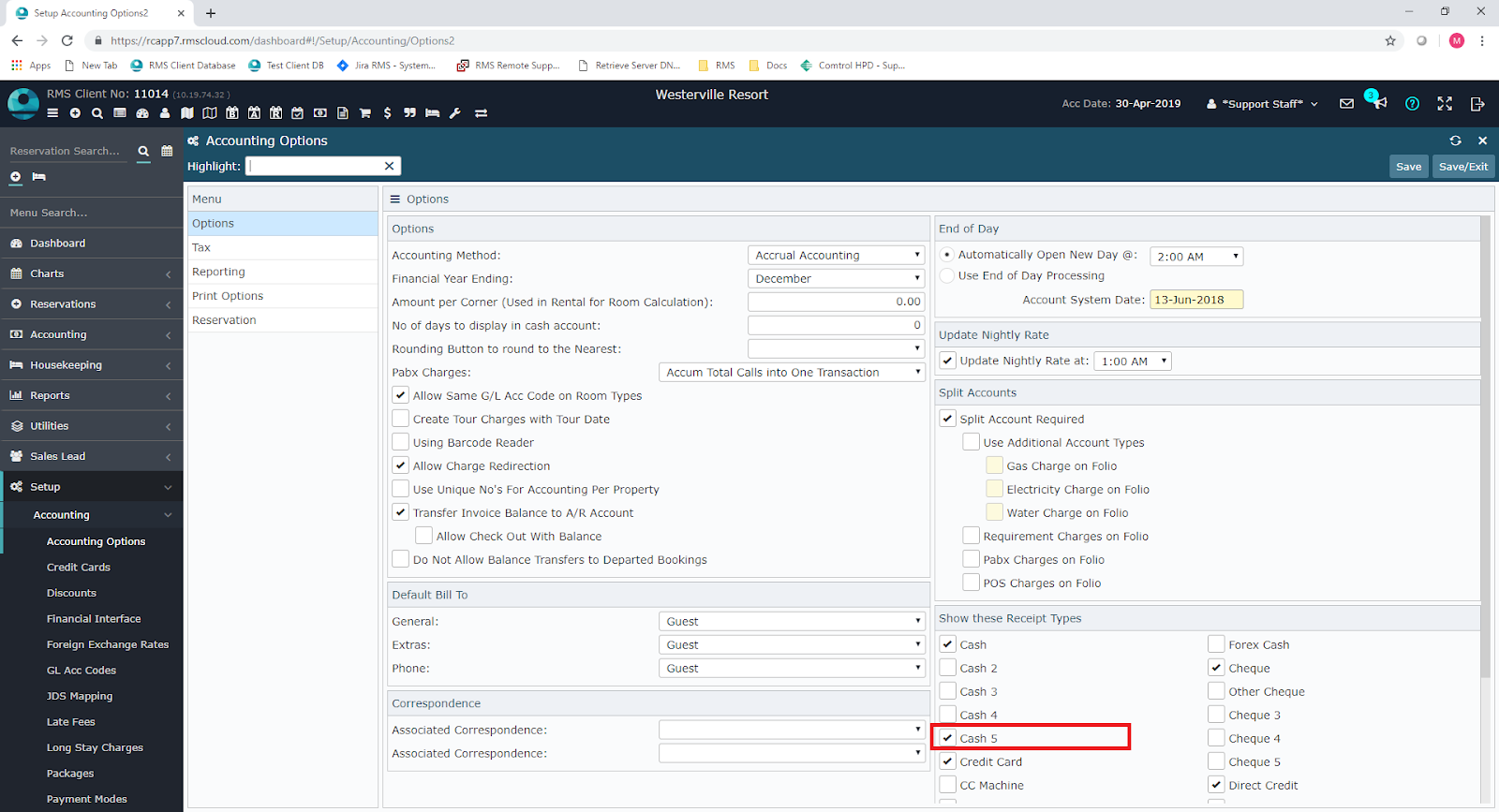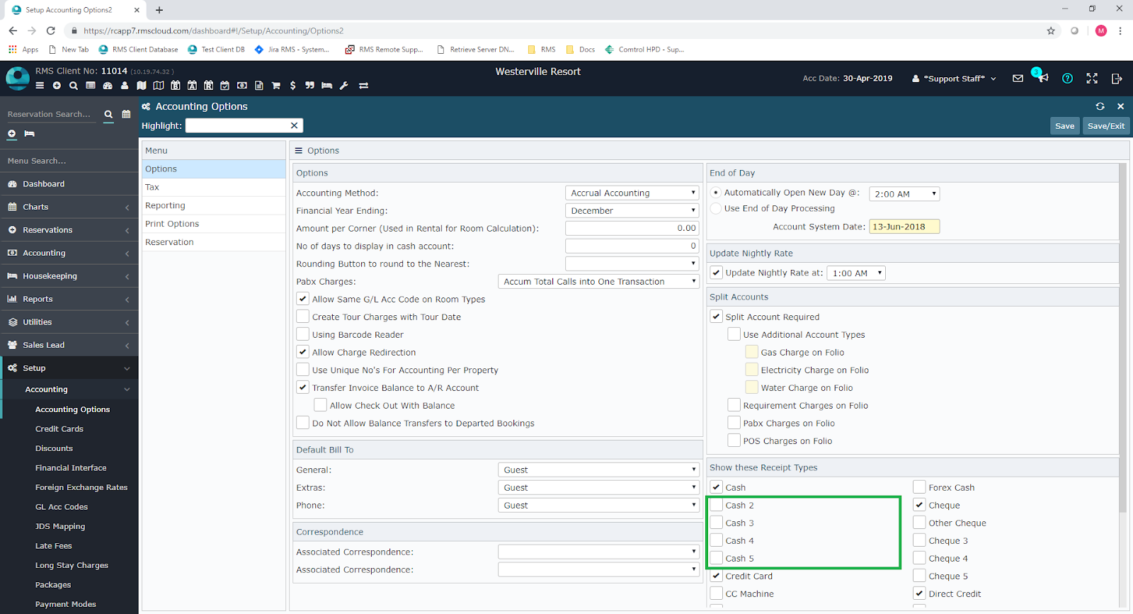 (Setup -> Accounting -> Accounting Options -> Options -> Show these receipt types)